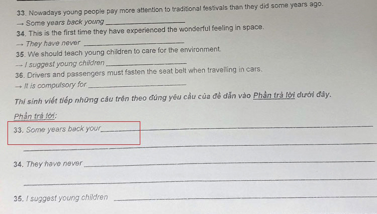 Trước đó, vào chiều ngày 2/6, sau khi kết thúc môn thi tiếng Anh thì rất nhiều bạn học sinh có phản ánh về việc phần gợi ý trả lời của câu hỏi 33 trong đề thi có thể bị in sai. Theo đó, đề bài yêu cầu thí sinh viết lại câu trả lời phù hợp với dữ kiện cho sẵn, nguyên văn nội dung của dữ kiện như sau: