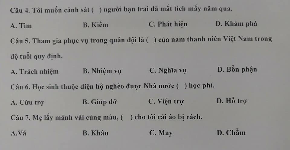Trong đề ôn tập này, phần đầu tiên là phần kiến thức ngôn ngữ với 7 câu hỏi dưới hình thức trắc nghiệm, yêu cầu thí sinh chọn từ thích hợp để điền vào chỗ trống. Nghe có vẻ đơn giản nhưng ngay từ câu hỏi đầu tiên đã khiến nhiều người “vò đầu bứt tóc”, vô cùng hoang mang không biết nên chọn đáp án nào cho đúng.