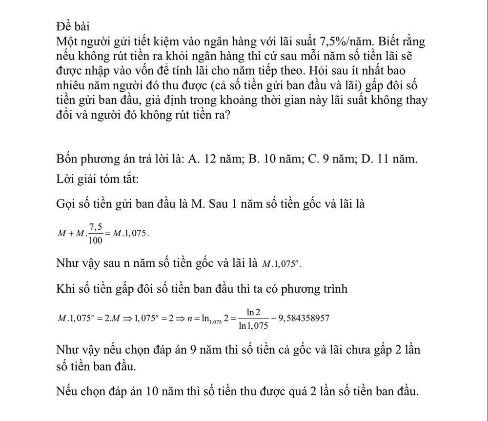 “Đề bài đáng lẽ phải hỏi là “số năm ít nhất để có thể thu được hơn 2 lần số tiền ban đầu là bao nhiêu?”, thay vì hỏi là “sau bao nhiêu năm người đó thu được gấp đôi số tiền ban đầu?”. Bởi vì không bao giờ gửi ngân hàng mà thu được cả vốn lẫn lãi được đúng gấp đôi số tiền ban đầu cả, vì lãi suất ngân hàng bị lẻ” - ông chia sẻ với Vietnamnet.