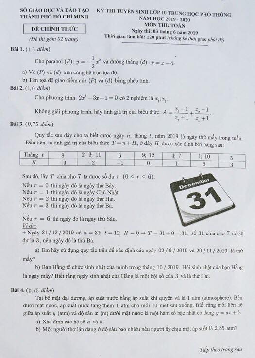 Đề thi môn Toán vào lớp 10 TPHCM năm 2019.
