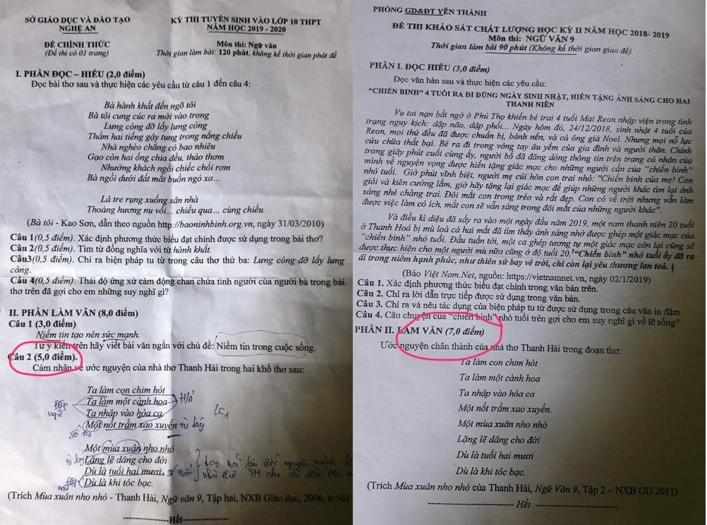 Đối chiếu giữa hai đề thi này, phần Làm văn đều có nội dung: “Ước nguyện chân thành của nhà thơ Thanh Hải trong hai khổ thơ 4, 5 của bài thơ Mùa xuân nho nhỏ”, cũng như trích dẫn khổ thơ giống hệt nhau.
