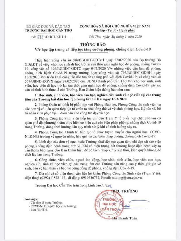 Thông báo của trường ĐH Cần Thơ về việc yêu cầu sinh viên quay trở lại trường từ ngày 16/3 tới