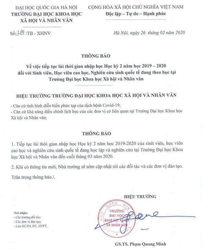 Qua trao đổi với Vietnamnet, GS.TS Phạm Quang Minh - Hiệu trưởng Trường ĐH Khoa học Xã hội và Nhân văn (ĐH Quốc gia Hà Nội), cho biết sau khi tổng hợp thông tin, đánh giá, cân nhắc trước những diễn biến phức tạp của dịch bệnh đang diễn ra trên thế giới, với mục tiêu cao nhất không để dịch bệnh lây lan, nhà trường quyết định cho sinh viên quốc tế nghỉ học đến cuối tháng 3/2020.