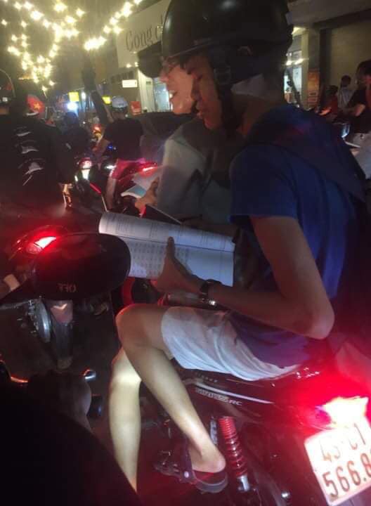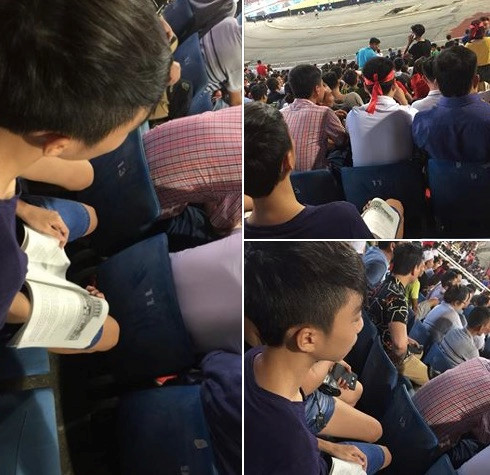 Thế nhưng, trong số đó, có rất nhiều cô cậu học sinh sinh viên, dù vẫn rất vui mừng với chiến thắng của đội tuyển nước nhà nhưng thay vì cầm cờ đỏ sao vàng… các cô cậu này lại cầm trên tay… sách vở, bút viết, máy tính… tranh thủ học bài.