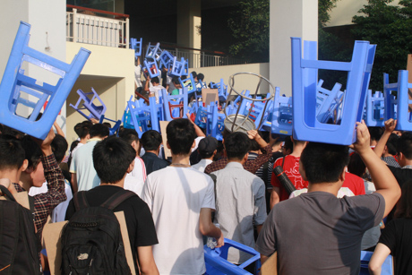 Hình ảnh sĩ tử tay cắp bảng vẽ, đầu đội ghế vào phòng thi quá quen thuộc với những ai chọn khối V-H (ảnh: Dantri)