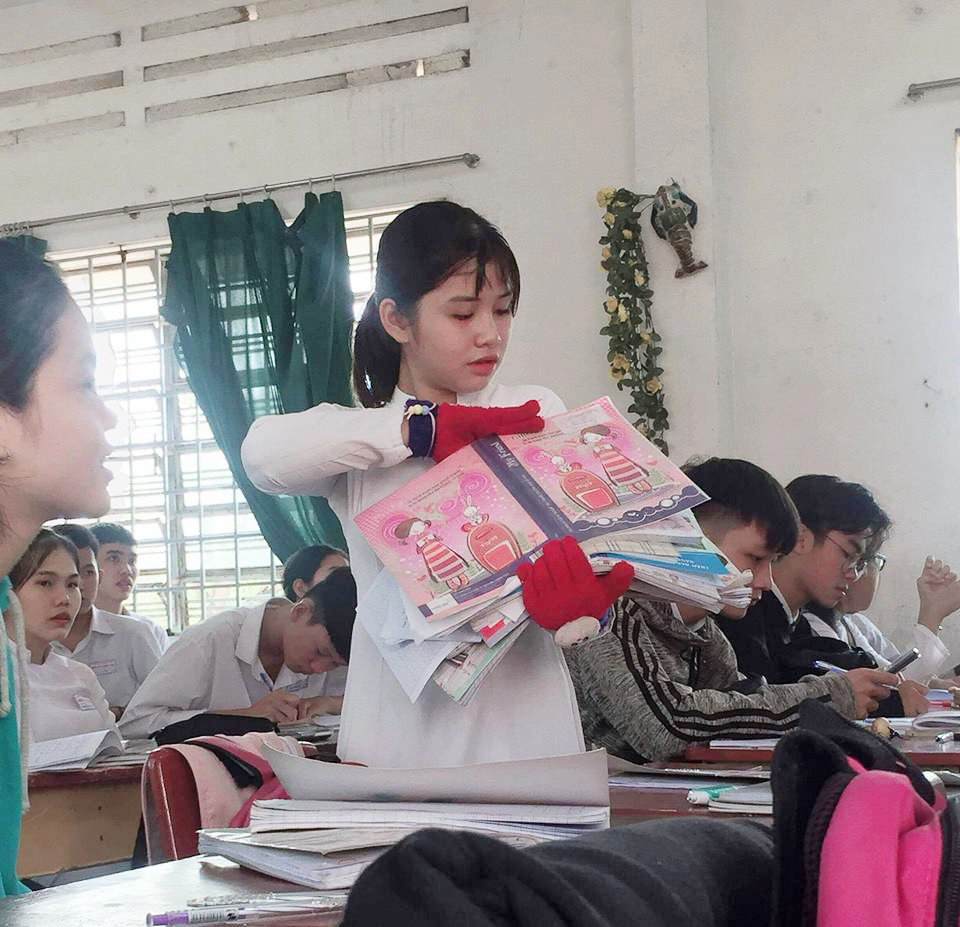 Mới đây, trên một diễn đàn học đường có tên Trường Người ta, cư dân mạng được dịp nhớ về thời cắp sách đến trường qua trò đùa của một nữ sinh với dòng chú thích: “Khi bạn mới làm nail nhưng lại muốn giấu thầy cô!”. Nhân vật chính trong ảnh đang thu vở bài tập của các thành viên, nhưng lại đeo găng tay dầy kín mít.