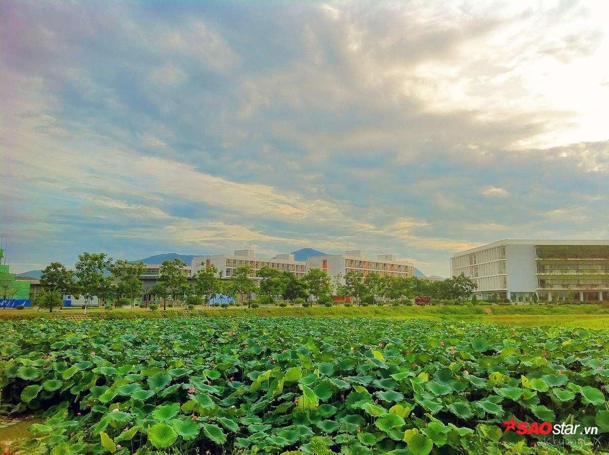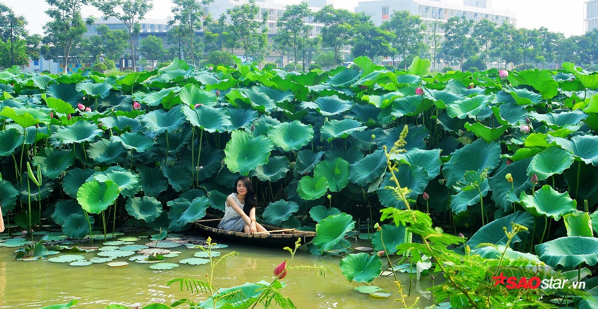 Khác với những địa điểm chụp hình khác thường thu phí, đầm sen của ngôi trường ĐH này hoàn toàn free vé tham quan, chụp ảnh. Những đóa sen ẩn hiện lấp ló giữa nền lá xanh mướt khiến cảnh vật lung linh hơn bao giờ hết. Kết hợp với ngôi trường ó kiến trúc đẹp làm cảnh sắc càng nên thơ hơn. Đây có lẽ cũng là thời điểm lý tưởng để các bạn trẻ tận hưởng những phút giây bình yên, nhàn nhã sau những giờ học tập, làm việc mỏi mệt.