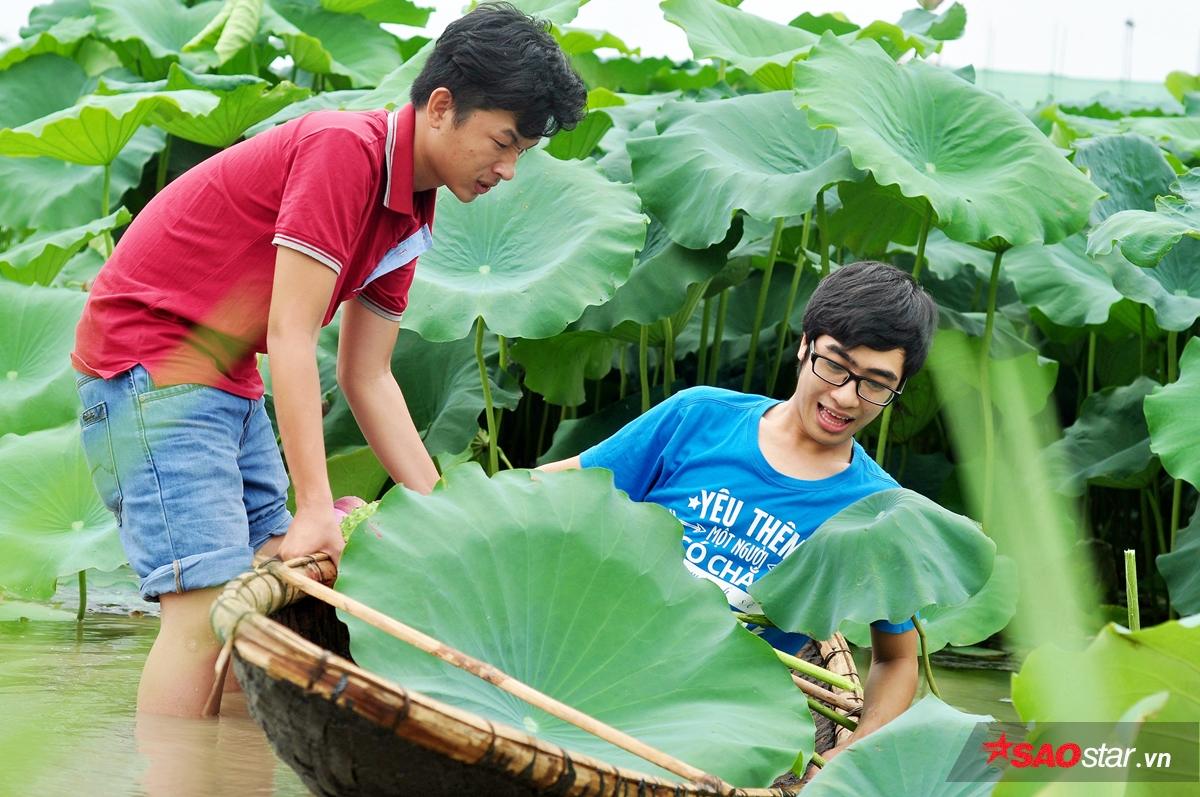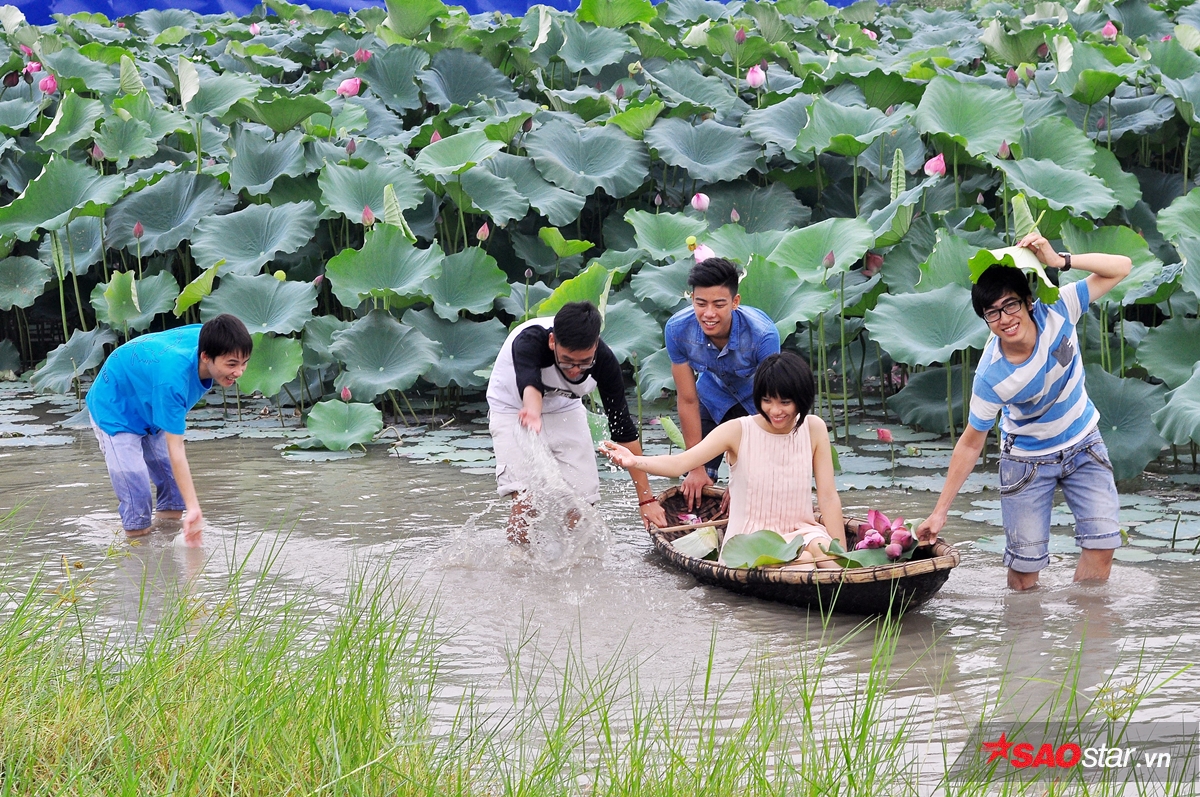 Nước trong đầm sen khá nông nên các bạn trẻ có thể lội hẳn xuống để nô đùa.