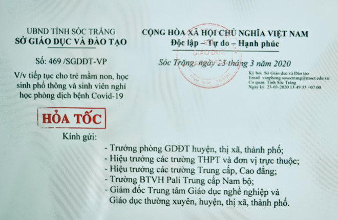 Công văn hỏa tốc của Sở Giáo dục và Đào tạo Sóc Trăng cho học sinh - sinh viên toàn tỉnh tiếp tục nghỉ học từ 24/3.
