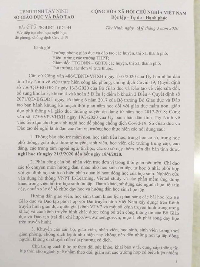 Học sinh, sinh viên toàn tỉnh Tây Ninh nghỉ học đến hết ngày 18/4.