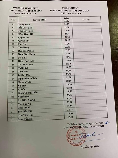 Danh sách điểm chuẩn thi vào lớp 10 của tỉnh Thái Bình.