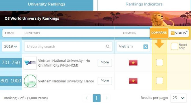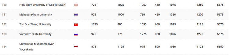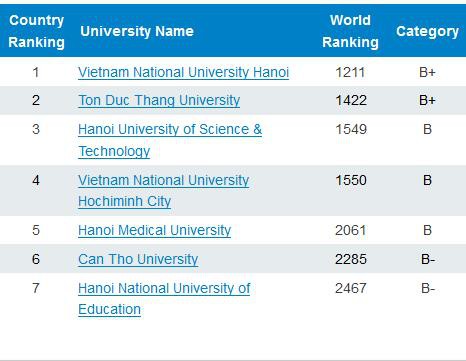 Trong 7 trường Đại học Việt Nam lọt Top, trường ĐH Quốc gia Hà Nội đạt thứ hạng cao nhất ở bậc 1.211/2500. Xếp sau trường ĐH Quốc gia Hà Nội lần lượt là các trường ĐH Tôn Đức Thắng (thứ hạng 1.422), ĐH Khoa học và công nghệ Hà Nội (thứ hàng 1.549), ĐH Quốc gia (thứ hạng 1.550), ĐH Y Hà Nội (thứ hạng 2.061), ĐH Cần Thơ (thứ hạng 2.285)…
