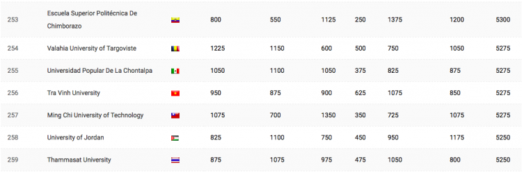 Trong đó, Đại học Tôn Đức Thắng xếp thứ hàng 182 với tổng điểm 5675; Đại học Trà Vinh xếp thứ hạng 256 với 5275 điểm.