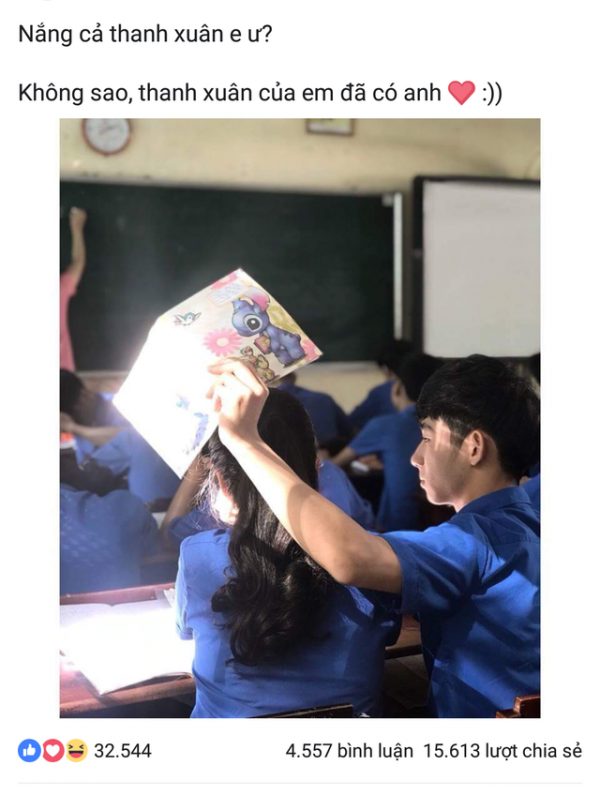 Năm vừa qua, cụm từ “dùng cả thanh xuân” để làm một điều gì đó được rất nhiều bạn trẻ ứng dụng. Cũng từ đây, dân mạng nổ ra rất nhiều trào lưu hài hước ăn theo phim ngôn tình. Một trong số đó là bắt chước cảnh che nắng, mưa của các cặp tình nhân trong phim điện ảnh.