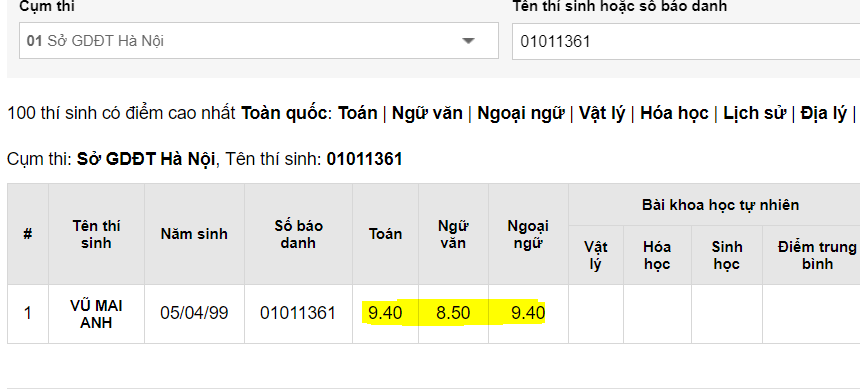 Kết quả thi THPT Quốc gia 2017 của Mai Anh.