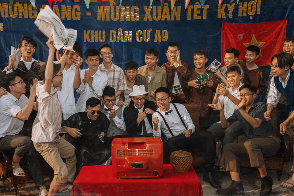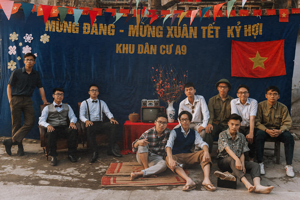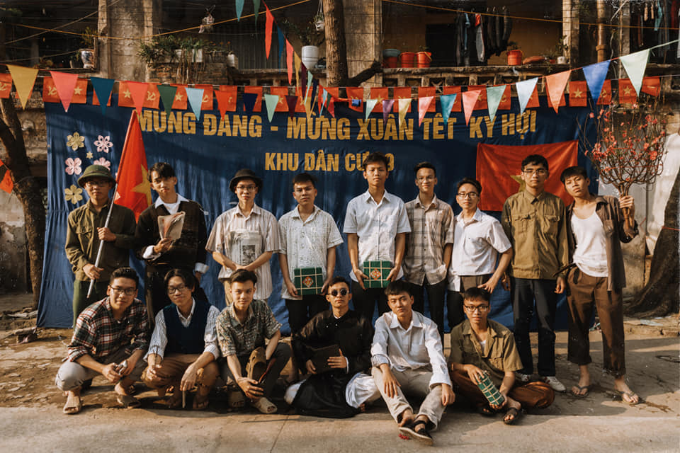 Có thể thấy, bối cảnh được thực hiện ở một khu dân cư đã cũ kèm nhiều đạo cụ mang đậm phong cách ngày xưa như lá cờ, băng rôn khẩu hiệu, bánh chưng, cành đào, hái hoa dân chủ… Điều đặc biệt hơn, trang phục thời ông bà được tận dụng làm bộ ảnh trở nên sống động và đẹp một cách lạ kỳ.