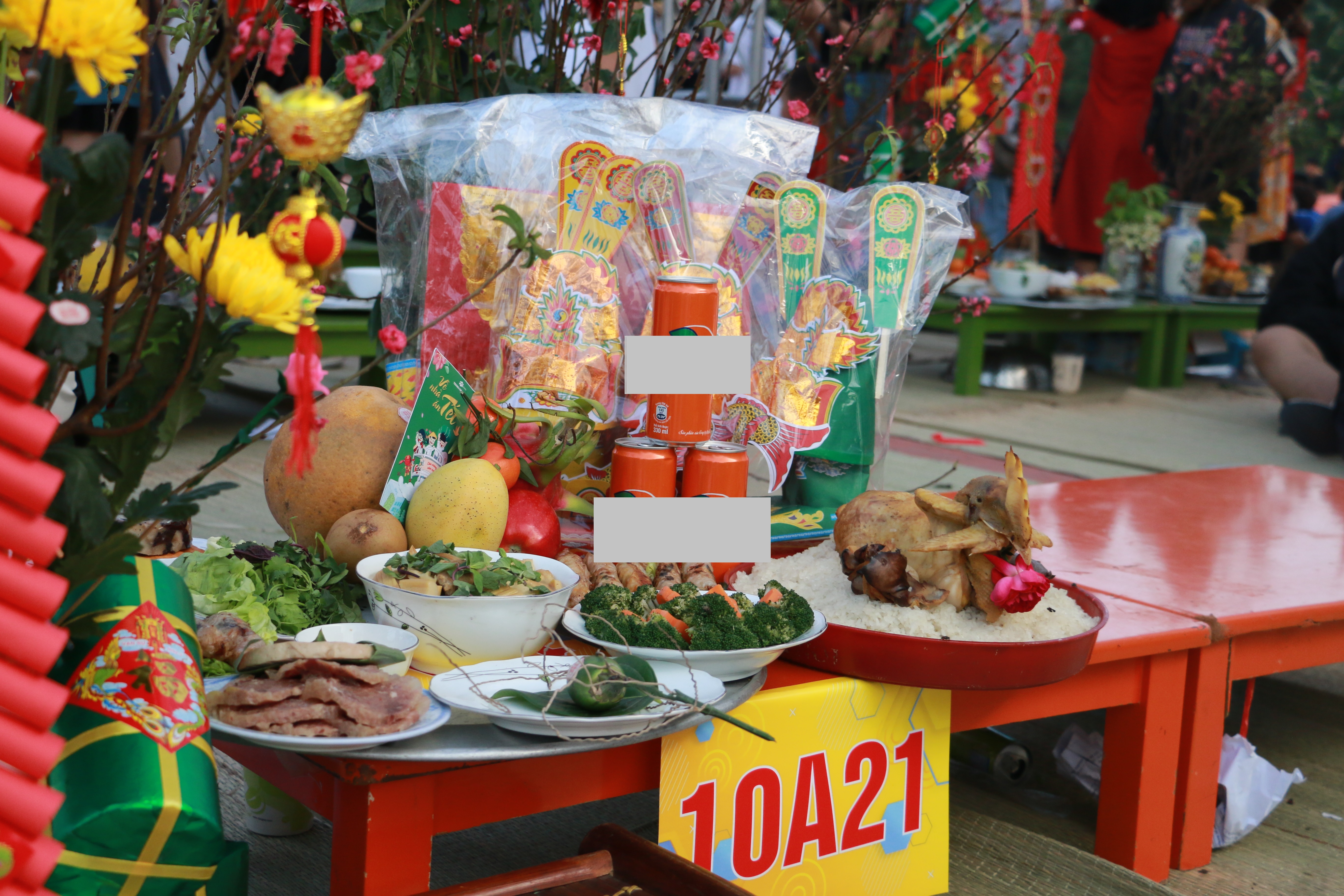 Vẫn biết ở trên trường, làm cuộc thi mâm cỗ chỉ là hình thức là chủ yếu, thế nhưng học sinh của trường THPT FPT thì không nghĩ đơn giản như thế. Ngoài trầu cau, bánh chưng, hoa quả, các cô cậu học trò còn mạnh tay đầu tư hẳn thêm: Gà luộc, nem chua rán, miến, xúc xích…và hàng trăm món ăn khác. Trông mâm cỗ thi trên trường có khác gì mâm cơm đủ đầy đêm 30 Tết mẹ nấu không nhỉ?