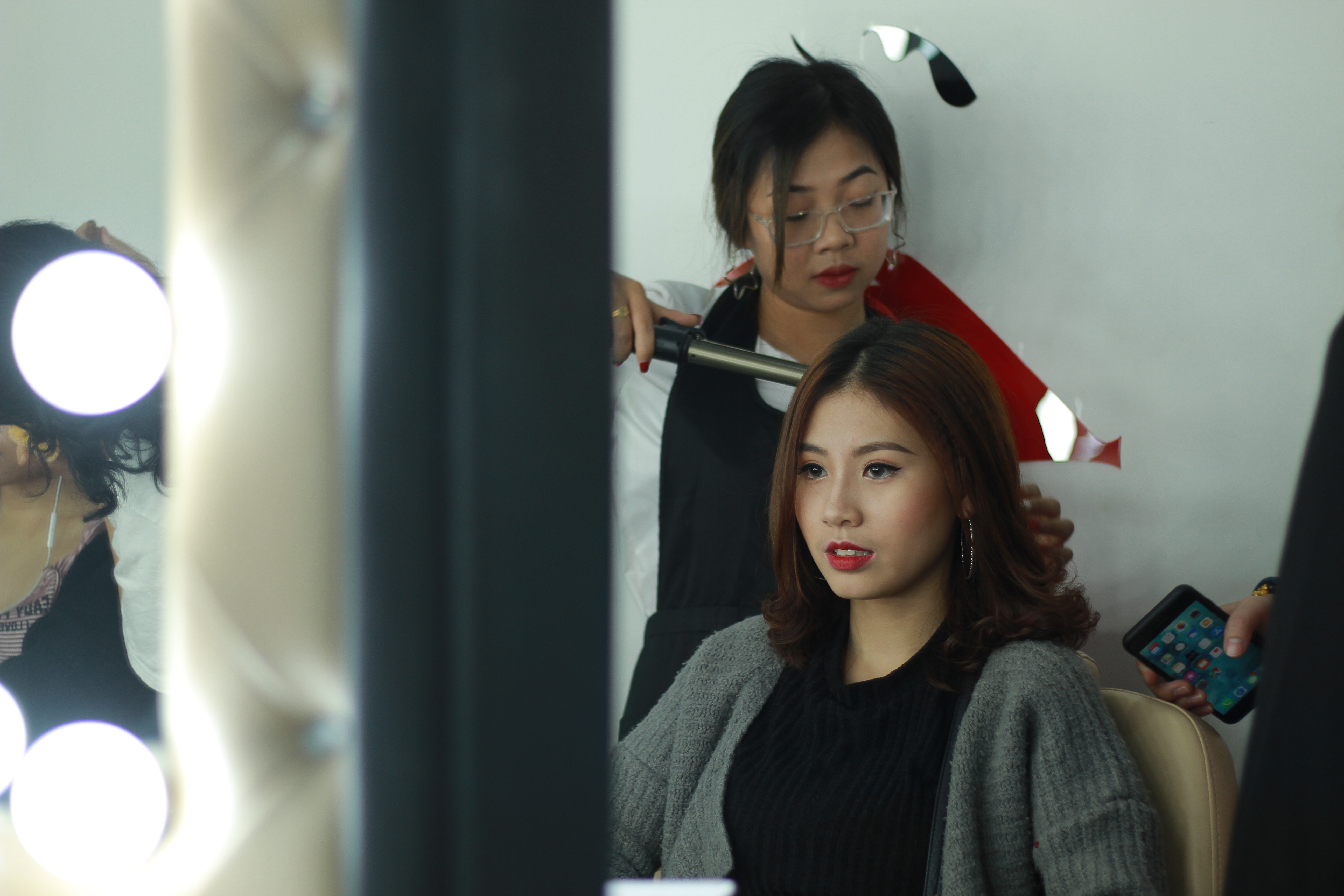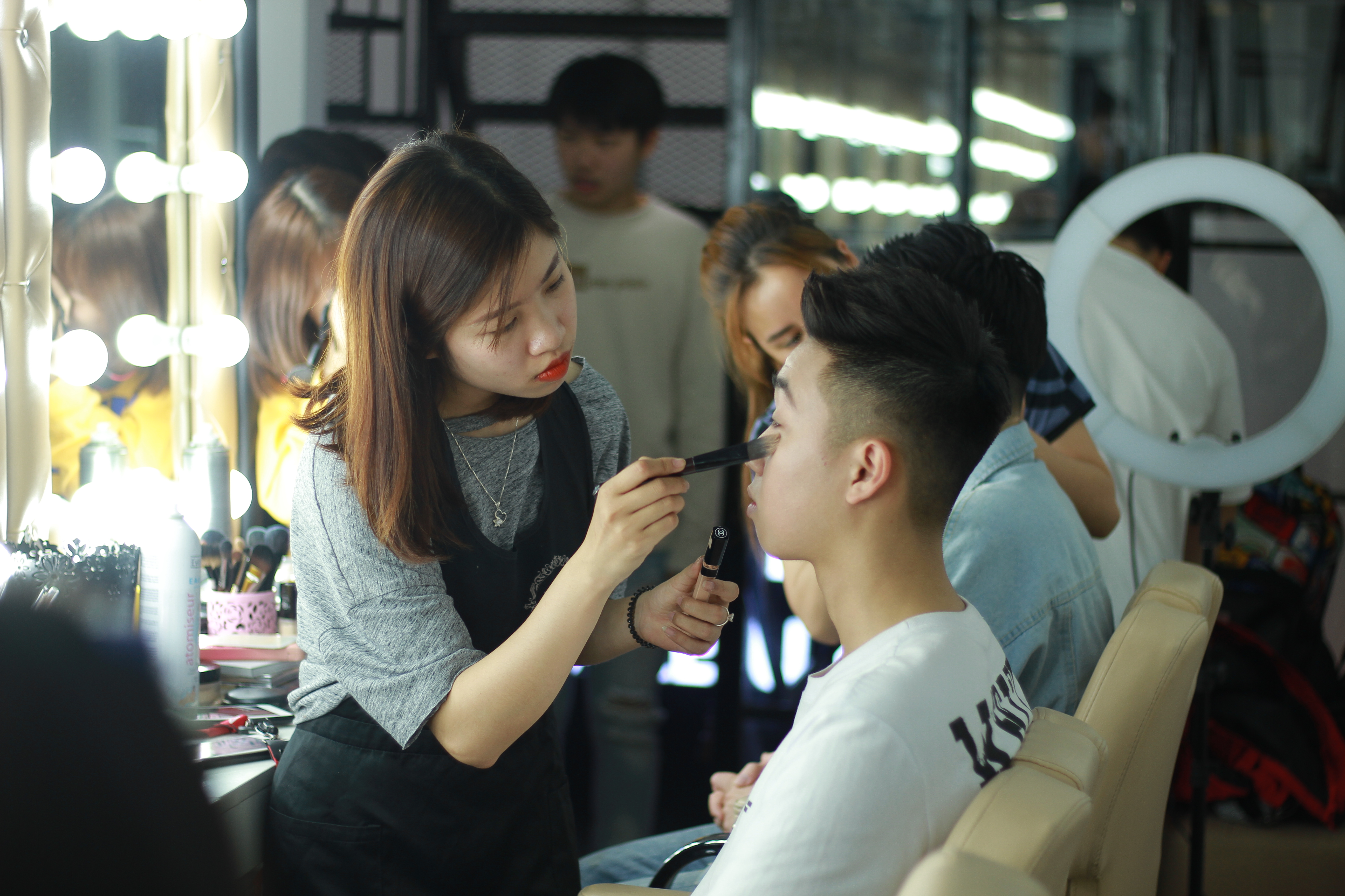 Các thí sinh đang được chuyên viên trang điểm “phù phép”.