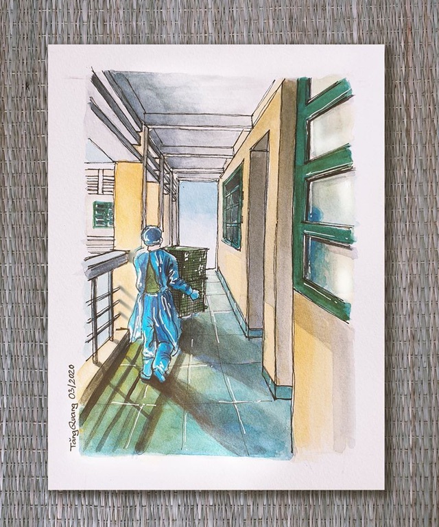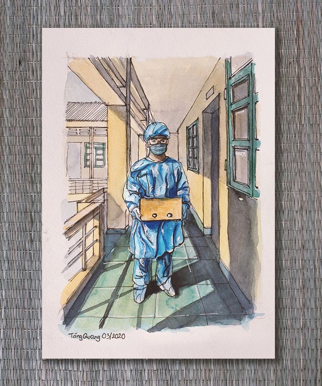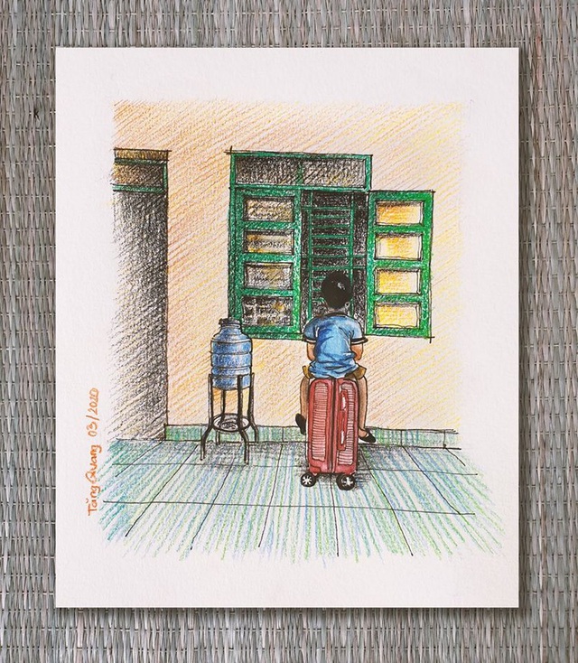 Quang cho hay, mỗi ngày, cậu bạn vẽ 4,5 bức, mỗi bức tầm 1 giờ, vẽ trong tầm 5 ngày. Trong khu cách ly chỉ có vài ba cây bút chì màu, hộp màu nước và 2 cây bút kim, Quang tận dụng tối đa những vật dụng này để vẽ nên những bức tranh chân thật nhất.