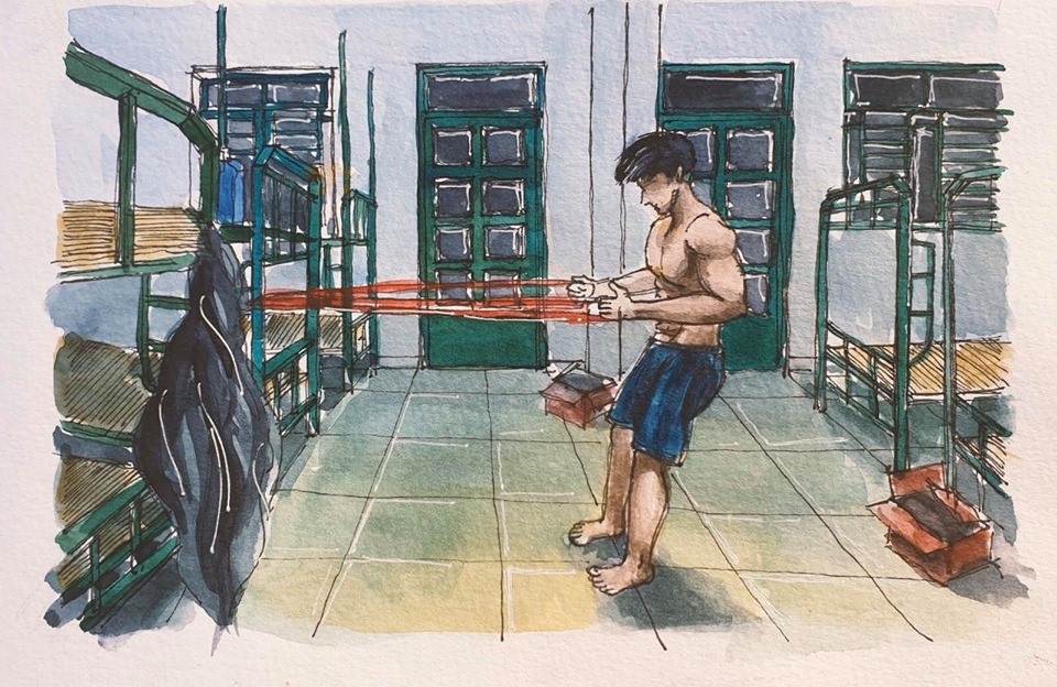 Đi cách ly nhưng không quên nhiệm vụ thể dục thể thao, nâng cao sức khỏe.