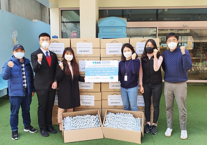 Mới đây, 5.000 chai nước rửa tay khô (trị giá khoảng 400 triệu đồng) được đóng thùng, chuyển đến du học sinh Việt Nam đang sống tại vùng có dịch ở Hàn Quốc. Đặc biệt, trên mỗi thùng hàng đều có dán bảng với dòng chữ “Sinh viên Việt Nam cố lên”.