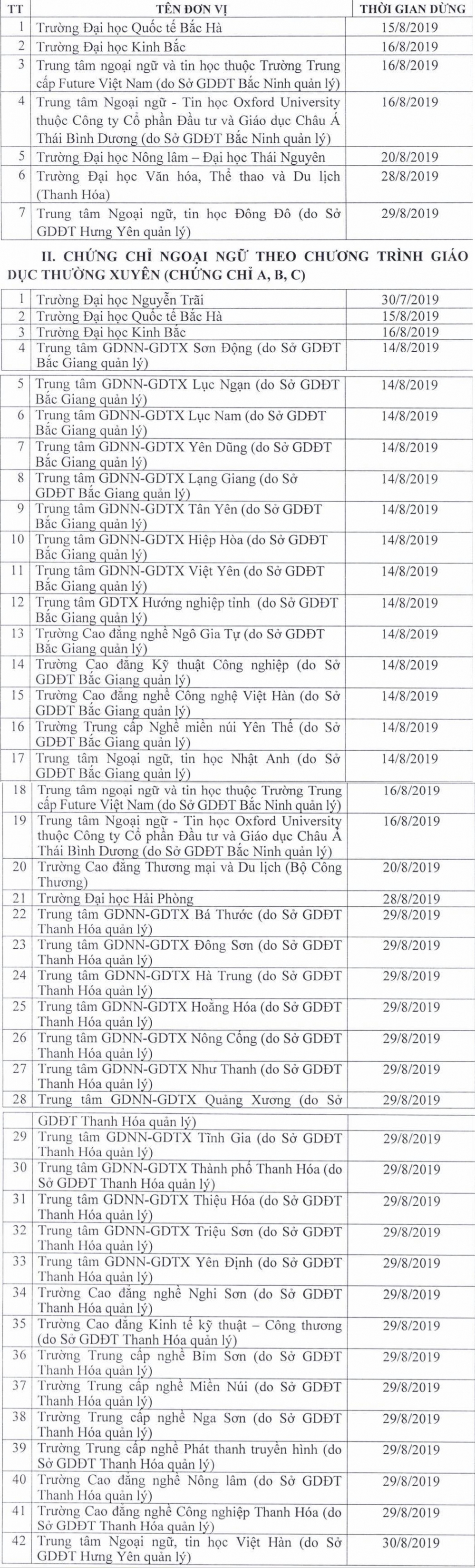 Đáng chú ý có 42 đơn vị phải dừng kiểm tra, sát hạch, cấp chứng chỉ ngoại ngữ theo chương trình giáo dục thường xuyên (chứng chỉ A, B, C).