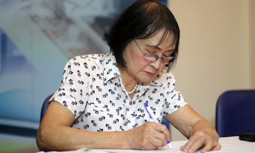 Vừa từ Singapore về nước tham dự Triển lãm chân dung những nhà khoa học, bà Nguyễn Thị Hòe tất bật với nhiều lịch hoạt động gặp gỡ, xen kẽ lịch làm việc với hãng sơn chi nhánh Hà Nội. Khó tin ở tuổi 72, người phụ nữ này vẫn dành nhiều tiếng lao động mỗi ngày.
