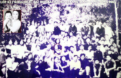 Cô nữ sinh NguyễnThị Hòe (khoanh đỏ) bế con gái út 9 tháng tuổi tại khoa Hóa - Đại học Bách Khoa năm 1966. Ảnh: NVCC.