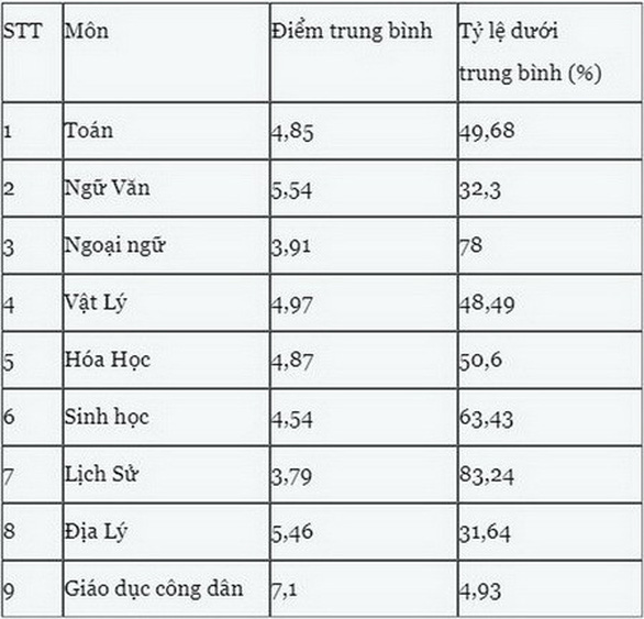 Trong đó “đội sổ” là môn lịch sử với hơn 83% số bài thi dưới trung bình. Điểm trung bình môn lịch sử cũng ở mức thấp nhất: 3,79 điểm.
