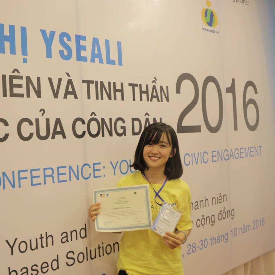 Kể lại về hành trình tới SSEAYP 2018, nữ sinh Luật nhớ lại những quyết tâm khi dành cho “tình yêu từ cái nhìn đầu tiên”: “Mình biết đến chương trình Tàu Thanh niên Đông Nam Á - Nhật Bản từ 2 năm trước. Khi ấy, Giang đã rất ấn tượng bởi rất nhiều bạn trẻ đã bước lên một con tàu khổng lồ cùng nhau đi qua 5 nước ASEAN. Tuy nhiên, mình không định apply SEAYP năm nay, vì lúc đó mình vừa trở về từ một chương trình trao đổi sinh viên và phải học bù rất nhiều môn học. Nếu nghỉ học tiếp thì mình sẽ phải tốt nghiệp chậm mất một năm so với các bạn đồng lứa, nhưng vì lỡ yêu SSEAYP quá rồi nên cứ apply. Mình cũng vô cùng biết ơn một người quen là cựu đại biểu năm 2016 vì đã động viên rất nhiều trong suốt quá trình ứng tuyển” - An Giang cho biết thêm.