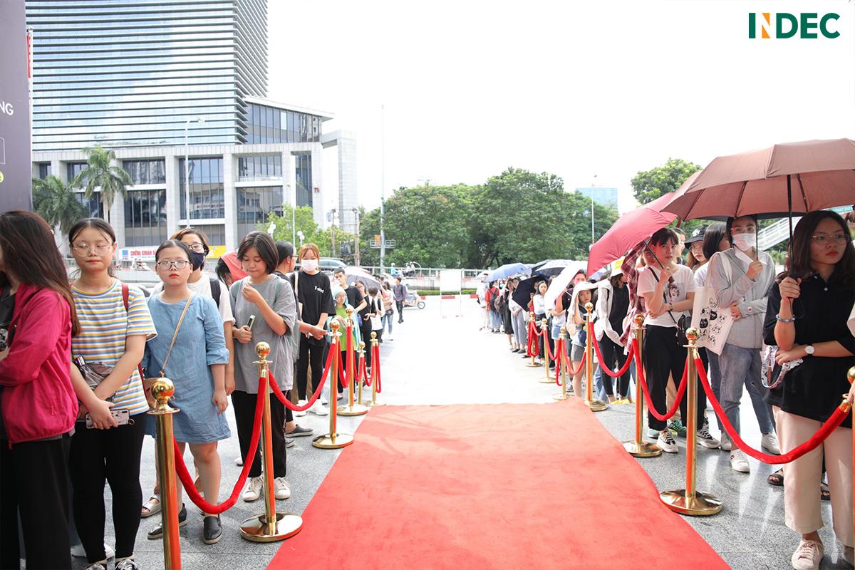 1 tiếng trước khi chương trình bắt đầu, trước cửa Nhà hát & Tổ chức sự kiện Star Galaxy các bạn học sinh đã xếp hàng dài chờ check in để được tham dự chương trình. INDEC rất vinh dự và tự hào khi được chào đón không chỉ các bạn học sinh, sinh viên tại các trường Đại học, THPT hàng đầu Hà Nội mà còn nhận được sự tin tưởng tham gia của các bậc phụ huynh học sinh.