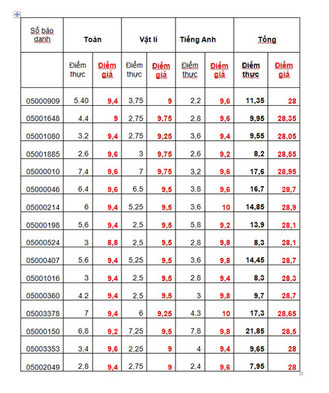 Cụ thể bảng điểm của thí sinh SBD 05001 trước đó là Toán 9; Vật lý 9,5; Hóa học 9 nhưng sau khi tiến hành chấm thẩm tra, kết quả môn Toán của thí sinh này chỉ đạt 1 điểm; Vật lý 2,75; Hóa học 3.