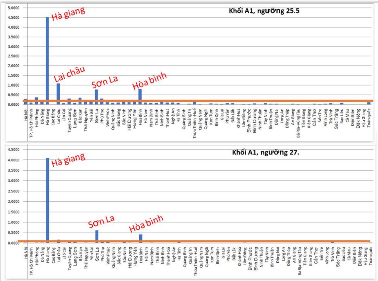 Ở tổ hợp khối A1 (Toán - Vật lí - Tiếng Anh), Hòa Bình có số thí sinh đạt 27 điểm trở lên cao gấp 20 lần Nam Định, 41 lần Hà Nội và 95 lần của TPHCM.