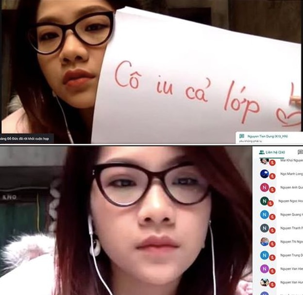 Trước đó, mạng xã hội từng xuất hiện hình ảnh một nữ giảng viên Đại học FPT (Hà Nội) được học sinh chụp lại trong lúc dạy online nhanh chóng thu hút sự chú ý của cư dân mạng. Sở dĩ, nhiều người dành sự quan tâm đến những bức ảnh này là vì nữ giảng viên này quá xinh đẹp và đáng yêu. Hơn nữa, cô giáo còn cầm tấm biển “cô yêu cả lớp” để nhắn gửi đến các bạn sinh viên của mình khiến nhiều người ấn tượng.