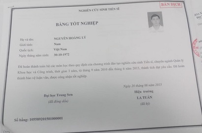 Bản photo bằng tốt nghiệp nghiên cứu sinh tiến sĩ của ông Nguyễn Hoàng Lý - Ảnh: Tuổi Trẻ Online