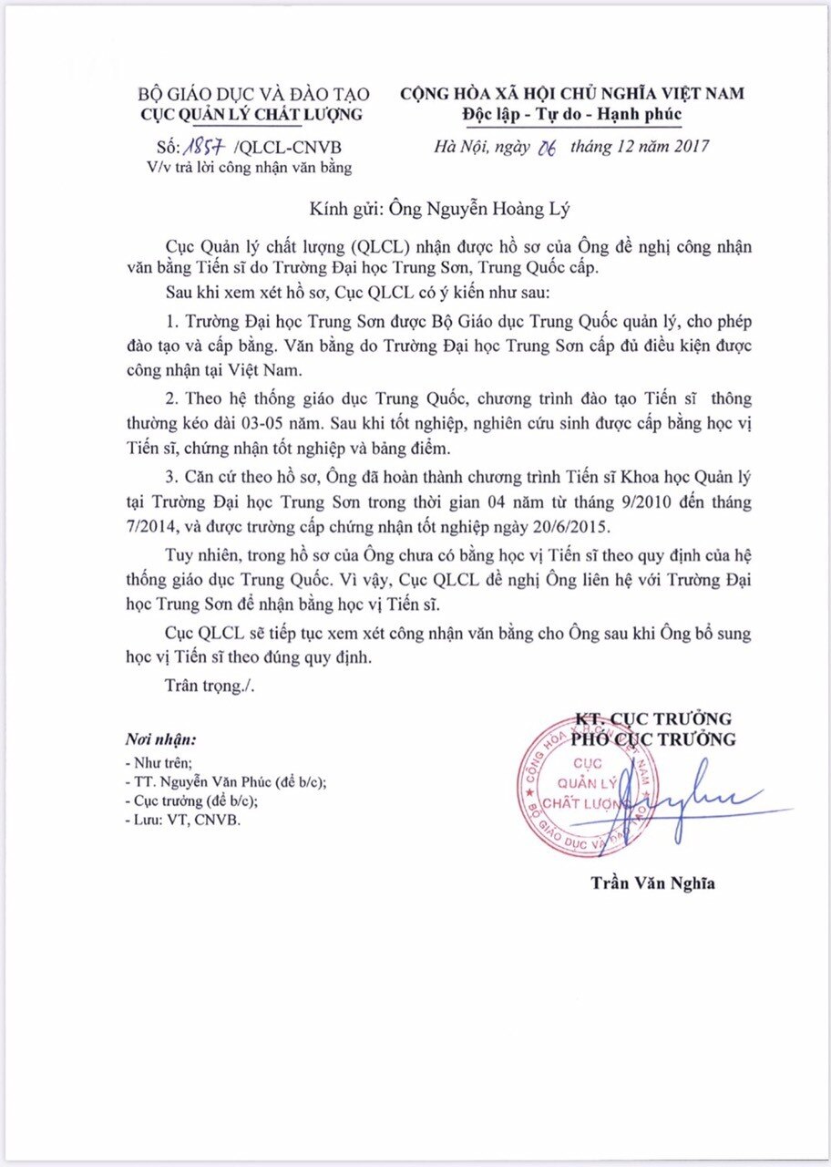 Cùng trao đổi với báo Tuổi Trẻ Online, ông Nguyễn Hoàng Lý cũng đưa ra tài liệu do Cục Quản lý chất lượng, Bộ Giáo dục và đào tạo trả lời ông năm 2017. Theo đó, ông Lý đã hoàn thành chương trình Tiến sĩ khoa học quản lý tại Trường đại học Trung Sơn và được cấp chứng nhận tốt nghiệp.