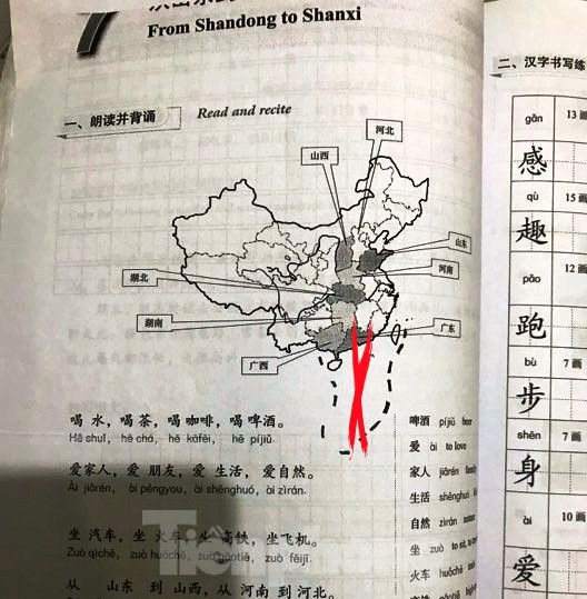 Tại trang 36 của cuốn giáo trình Đọc sơ cấp 1 “Developing Chinese” bài 7 in hình bản đồ Trung Quốc có “đường lưỡi bò”. Khi nghiên cứu, sinh viên mới phát hiện ra. Vụ việc sau đó đã được báo lên Ban giám hiệu nhà trường. Ảnh: báo Tiền Phong