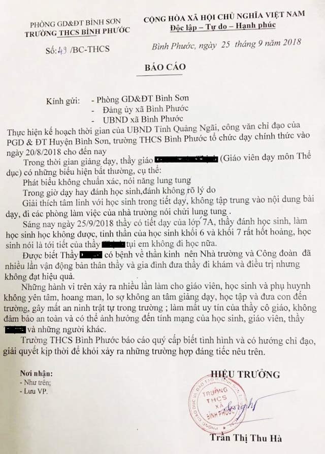 Theo báo Dân Việt, trong báo cáo gửi Phòng GDĐT huyện Bình Sơn (số 49/BC-THCS), do bà Trần Thị Thu Hà - Hiệu trưởng trường THCS Bình Phước ký ngày 25/9/2018, xã Bình Phước nêu rõ những hành vi bất thường của giáo viên P.T.B: “Phát biểu không chuẩn xác, nói năng và chửi lung tung. Giải thích tâm linh cho học sinh trong giờ dạy và hay đánh học sinh không rõ lý do…”.