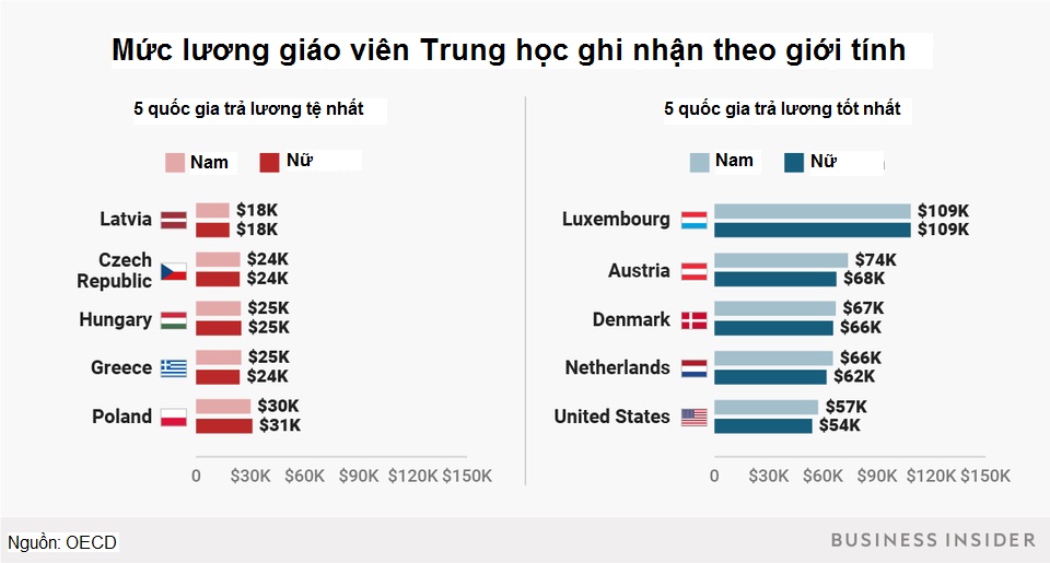 Lại một lần nữa, Luxembourg vẫn duy trì sự ổn định khi dẫn đầu danh sách 5 nước trả lương tốt nhất theo giới tính cho giáo viên trung học. Cả giáo viên nam và nữ đều được trả mức cao nhất là 109.000 USD/năm.