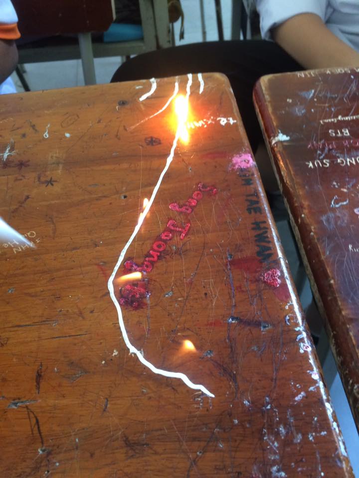Cụ thẻ, các bạn thể hiện màn vẽ trái tim rực sáng rất đẹp. Theo đó, chỉ cần một chiếc bút xóa và bât lửa là có thể làm được. Một bạn nam cầm bút xóa di mực vẽ hình trái tim, bạn còn lại cầm bật lửa đốt. Lửa sẽ cháy theo cồn có trong mực bút xóa, lan tỏa đến khi bạn nam vẽ xong hình trái tim. Khoảnh khắc hình vẽ cháy sáng, bùng lên lửa đỏ khiến rất nhiều người thích thú.