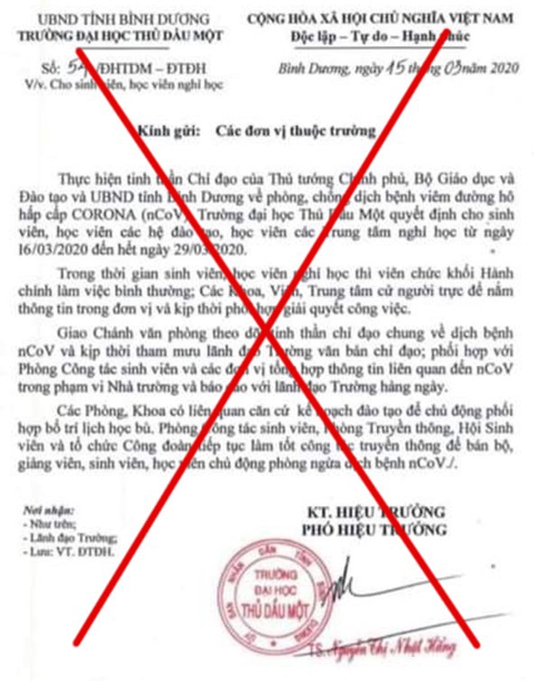 Mới đây đại diện trường ĐH Thủ Dầu Một, tỉnh Bình Dương cho biết, Sở Thông tin và Truyền thông Bình Dương đã phối hợp Công an tỉnh làm việc với 2 người lan truyền văn bản giả về việc cho sinh viên nghỉ học trên Facebook. Đó là T.V.T. (sinh năm 2001) và V.T.D. (sinh năm 1997), đều là sinh viên của trường ĐH Thủ Dầu Một.