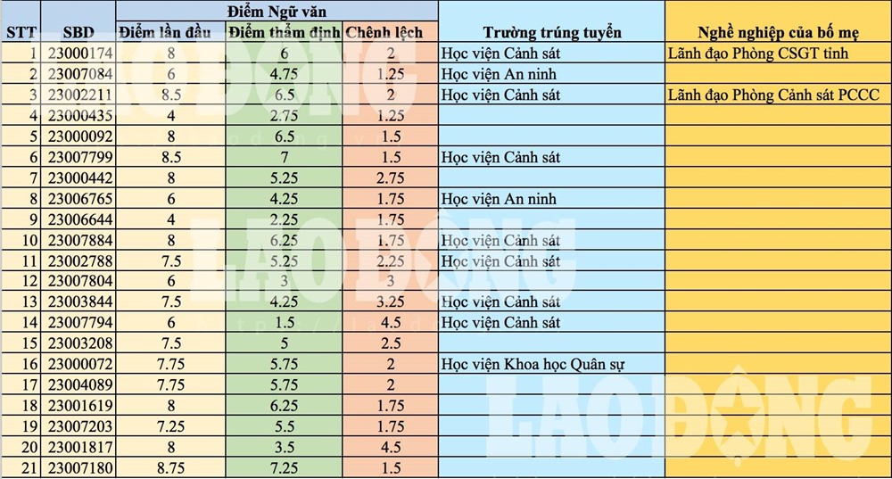 Kết quả xác minh của Báo Lao Động cho thấy nhiều em trong số này đã trúng tuyển vào các trường công an nhân dân. Trong đó, điểm môn Ngữ văn của thí sinh T.Đ.C (SBD 23007794) được nâng từ 1,5 lên 6 điểm (tăng 4,5 điểm) đã trúng tuyển vào Học viện Cảnh sát. Thí sinh C còn được nâng Toán 2,8 lên 8,2; môn Sử 2,75 lên 8,5. Tổng số điểm được nâng là 10,2 điểm.