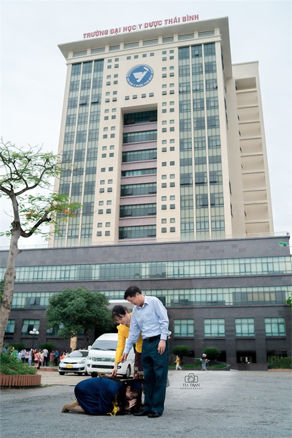 Cụ thể hình ảnh được ghi lại tại trường Đại học y dược Thái Bình, một nữ sinh trong bộ trang phục tốt nghiệp Đại học đã quỳ lạy dưới chân bố mẹ của mình, bố mẹ của nữ sinh cũng tỏ ra bất ngờ trước hành động này của cô con gái. Liên hệ với bạn Tú Trần, người đã “nháy” được khoảnh khắc vô cùng quý giá này chia sẻ: “Bạn ấy là người Lào, vừa thi tốt nghiệp xong nên bố mẹ bạn ấy đã bay sang Việt Nam để chúc mừng con gái. Nhìn thấy ảnh quỳ mọi người hãy ngưng phán bừa rằng đây là hành động lố lăng, bởi đó là phong tục của dân tộc họ, không ai có quyền phán xét”.