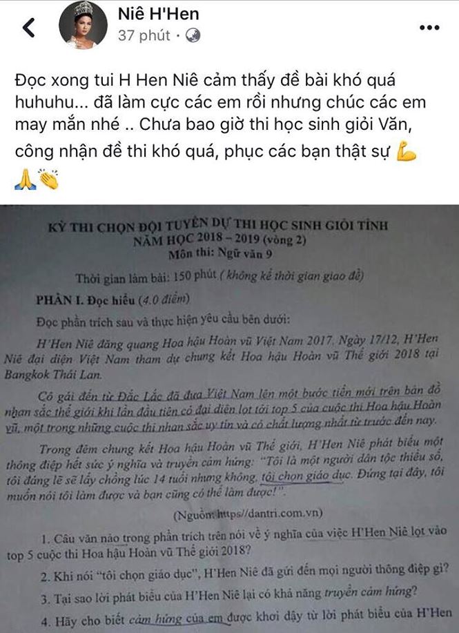 Ngay cả H'Hen Niê cũng tỏ ra bất ngờ trước đề thi thú vị này: “Đọc xong đề thi, H'Hen Niê cảm thấy khó quá. Đề làm cực các em rồi, nhưng chúc các em may mắn nhé. H'Hen Niê chưa bao giờ thi học sinh giỏi Văn, công nhận đề thi khó quá, phục các bạn thật sự”.