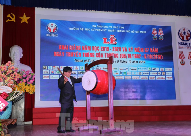 PGS Đỗ Văn Dũng, Hiệu trưởng trường ĐH Sư phạm Kỹ thuật TPHCM đánh trống khai giảng. Ảnh: báo Tiền Phong.