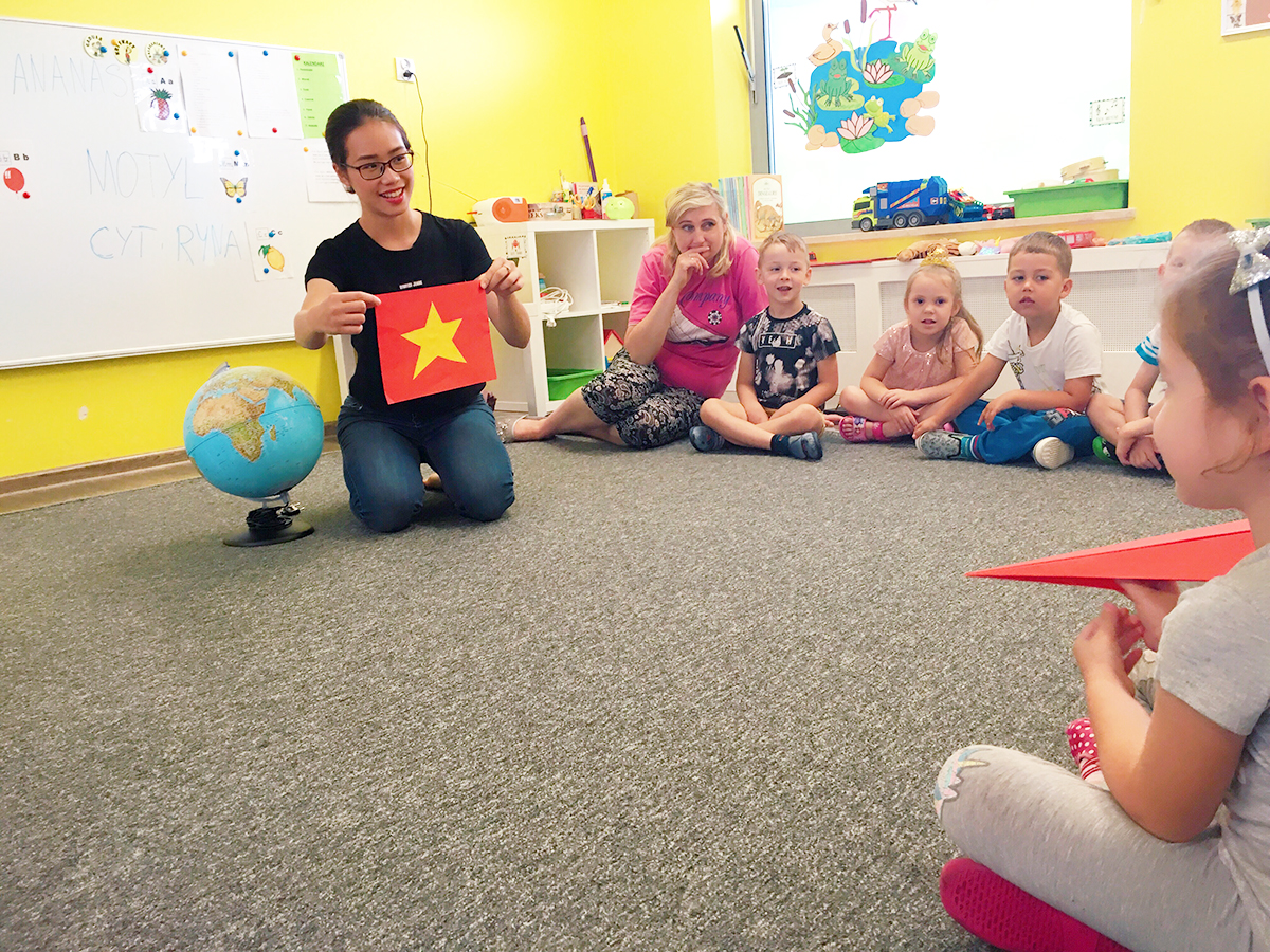 Chia sẻ về những kỉ niệm trong quá trình tham gia hoạt động tình nguyện dài hơi của mình, 9x hào hứng: “Mình đã vi vu tổng cộng 5 nước: Pháp, Ý, Séc, Hungary và Ba Lan. Trải nghiệm dạy tiếng Anh và văn hoá đa quốc gia cho các bé Ba Lan là trải nghiệm tuyệt vời đối với mình. Hàng ngày mình sẽ chuẩn bị một topic để dạy, có thể là về đồ ăn, quần áo, công việc… Trong mỗi topic đó đều lồng ghép những nét riêng của văn hoá Việt Nam và truyền tải đến cho các bé.