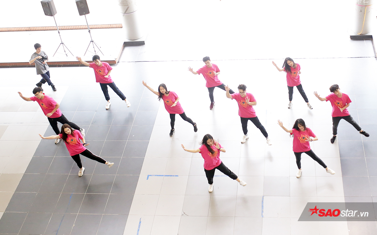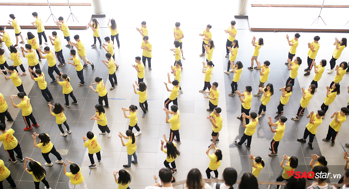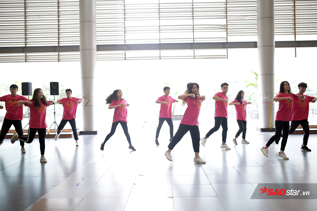 Tại sảnh lớn, trong tiếng nhạc rộn rã, khoảng các bạn đã cuồng nhiệt hết mình với những vũ điệu sôi động, chinh phục toàn bộ khán giả đứng kín dọc hành lang bởi sự đồng đều, ăn ý giữa các thành viên tham gia bài nhảy.