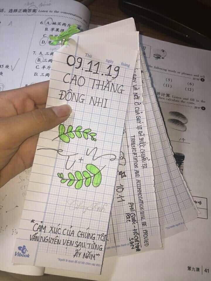 Theo đó, thay vì sử dụng giấy in thiệp cưới, các bạn trẻ đã sử dụng “cây nhà lá vườn” là giấy tập, viết màu để trang trí y như tấm thiệp được cặp đôi này gửi đến bạn bè, quan khách của mình đã công bố trước đó.