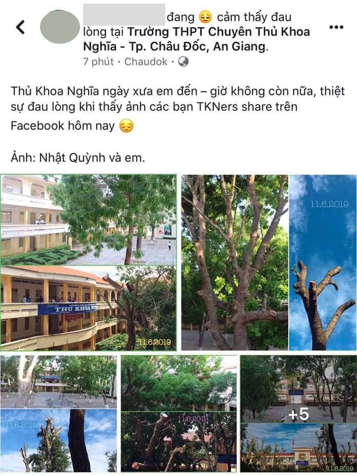 Thế nên sự đổi thay của những “nhân chứng sống” ấy bao giờ cũng tạo nên những sự tiếc nuối, luyến tiếc trong tâm trí của bao thế hệ học sinh. Mới đây, những bạn học sinh đã và đang theo học tại ngôi trường giàu truyền thống bậc nhất của tỉnh An Giang - THPT chuyên Thủ Khoa Nghĩa đã không khỏi xúc động khi những hình ảnh hàng cây cổ thụ bị tỉa “trắng” cành, một số chỉ còn lại thân cây.