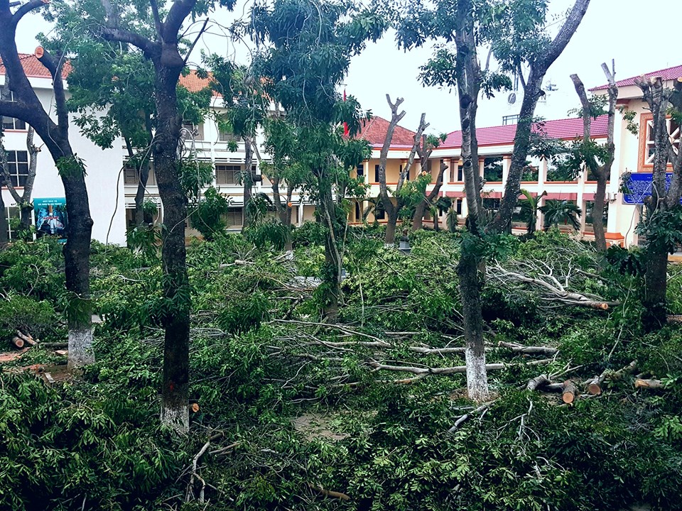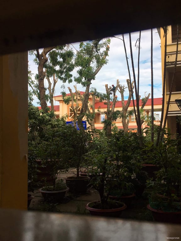 Hàng cây của trường đã được tỉa “trơ trụi”. Ảnh: Nhật Quỳnh